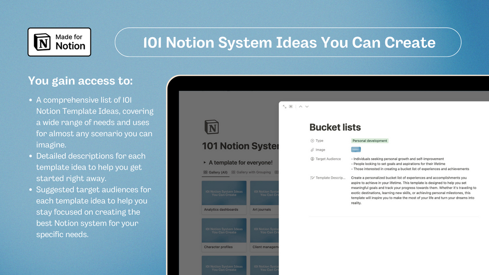 - Suggested target audiences for each template idea to help you stay focused on creating the best Notion system.