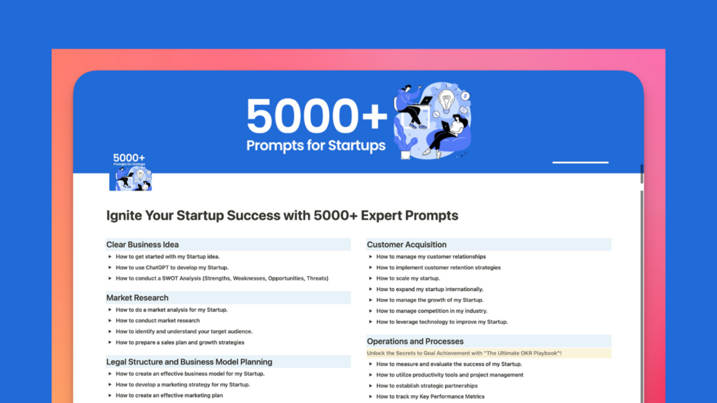 Are you ready to transform your startup dreams into reality? Our 5000+ Prompts for Startups is your ultimate companion in the exhilarating world of entrepreneurship!